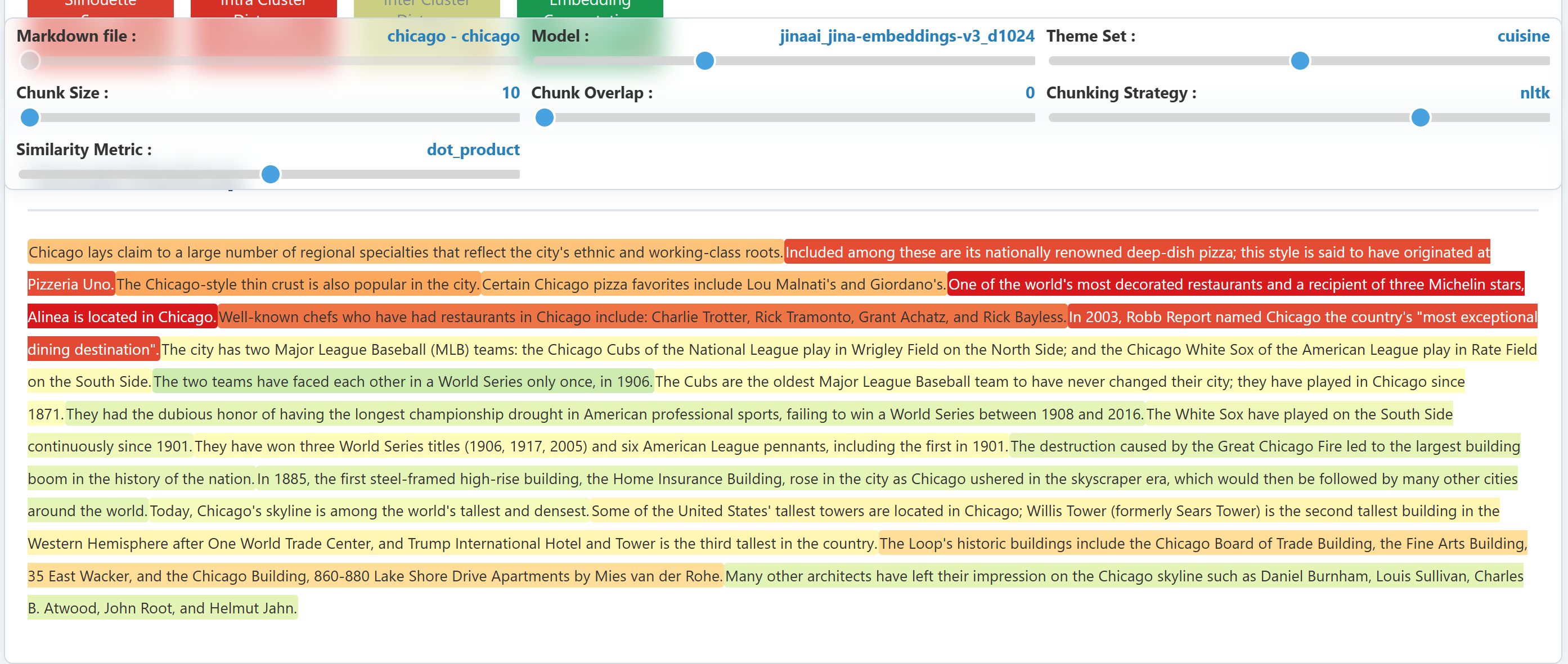 Red text: High similarity with theme keywords (relevant chunks)